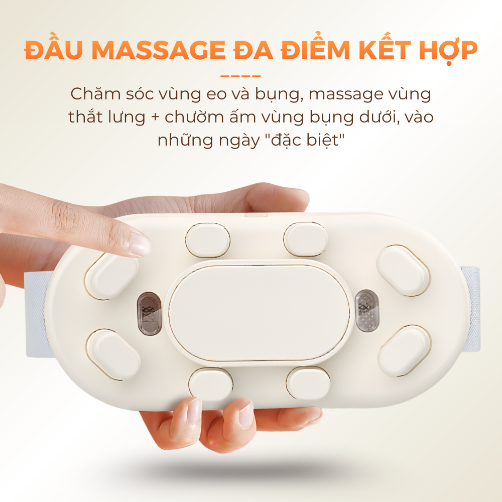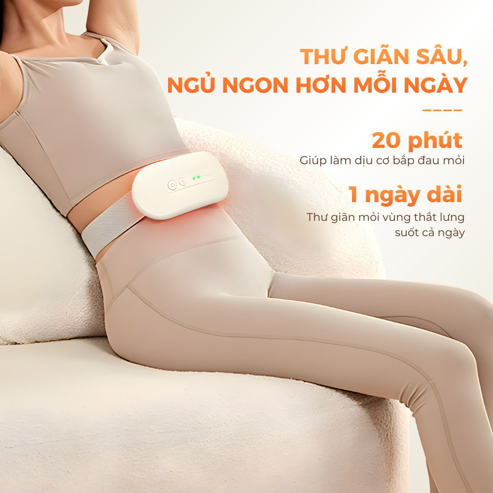 Máy massage bụng B1 là đai massage bụng mini ứng dụng rung massage kết hợp chườm ấm 45–65°C và ánh sáng đỏ 660nm, giúp giảm đau bụng kinh, thư giãn vùng bụng – lưng dưới và hỗ trợ phục hồi da sau sinh. Thiết bị giúp tăng tuần hoàn máu, làm dịu co thắt, giảm cảm giác khó chịu trong kỳ kinh và hỗ trợ chăm sóc cơ bụng hiệu quả.