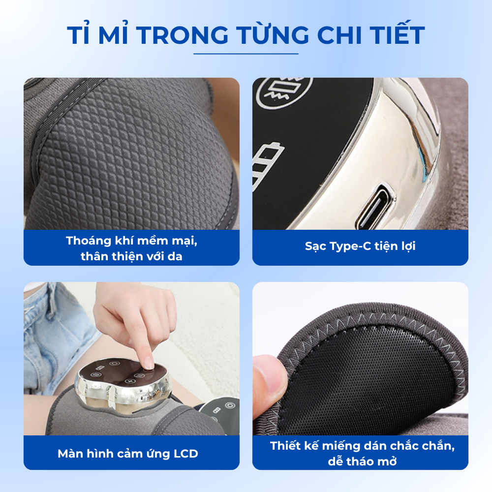 Máy sở hữu 3 chế độ massage, 3 mức rung, 7 mức nhiệt tùy chỉnh, màn hình LED cảm ứng hiện đại dễ thao tác. Pin sạc 2000mAh không dây, sử dụng liên tục đến 120 phút, tiện lợi dùng tại nhà, văn phòng hoặc mang theo khi đi xa. Ngoài đầu gối, máy còn có thể dùng cho khuỷu tay, vai, phù hợp cho nhu cầu massage đa vùng.